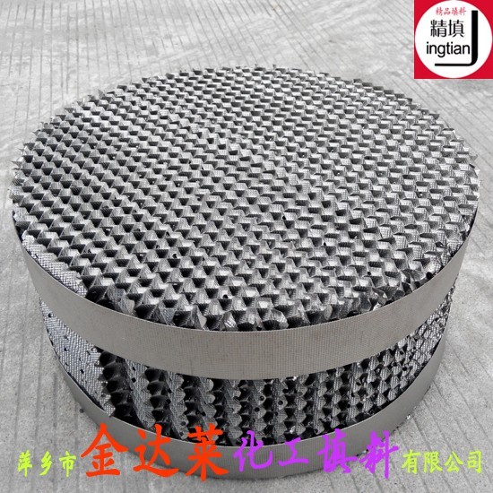 JKB-250金属孔板波纹填料是解决金属丝网波纹填料存在价格贵、忌堵塞等局限性加工研制而成的一种不锈钢板孔型波纹规整填料,进一步扩大在精馏、吸收等方面的应用。金属孔板波纹填料保持了金属丝网波纹填料的几何规则结构特点,改用表面有沟纹的孔板制成,其性能介于金属丝网波纹填料和鲍尔环、阶梯环等散堆填料之间。