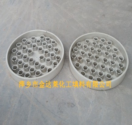 陶瓷分布器采用硅酸盐耐火特种陶瓷材料加工而成,具有强度高,耐高温、耐酸碱、抗腐蚀性好,不易破碎和变形,承载重量大,使用寿命长等。在使用过程能有效减少由于液体不良分布所引起的放大效应,充分发挥瓷球、陶瓷波纹填料、金属散堆填料、塑料阶梯环等散堆填料的效率,在填料塔中安装液体分布器,把液体均匀地分布于填料层顶部。液体初始分布的质量不仅影响着填料的传质效率,而且还会对填料的操作弹性产生影响。因此,陶瓷液体分布器是填料塔内极为关键的内件,陶瓷分布器的种类比较多,选择的依据主要有分布质量、操作弹性、处理量、气体阻力、对水平度等许多方面。我公司生产的陶瓷分布器结构设计合理、空隙率大、压力降小、接触表面积大、传质能力强安。安装、操作、维修方便。