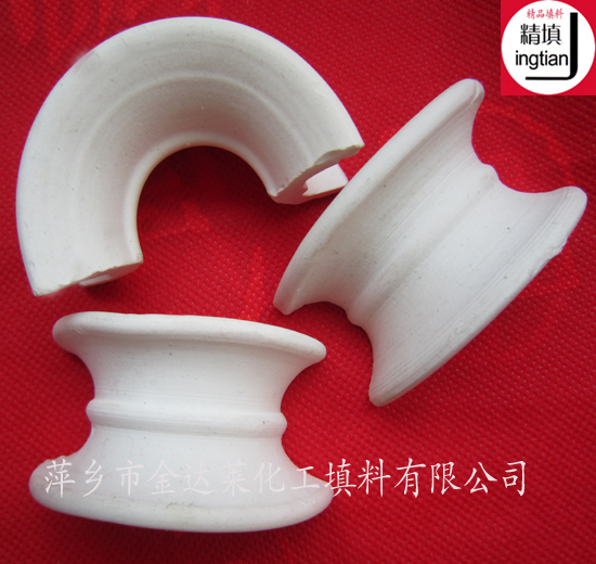 陶瓷矩鞍环采用耐高温、耐化学腐蚀的化学瓷配方为基理,应用江西特产含稀土元素的优质高岭土、含铝粘土添加成型助剂、脱模剂经系列特殊工艺加工而成。产品外形具有平滑弧形侧面,且内外曲率半径不同,从而避免了叠套的可能性,这样其床层空隙率均匀,床层具有较大的空隙率,液体分布性能好。床层内多为圆弧形液体通道,减少了气体通过床层的阻力,也使液体向下流动时的径向扩散系数减小。同时在填料床层内,增加了填料间接触的空隙,使之更有利于气体和液体在填料中的流动和分散。耐酸陶瓷矩鞍环填料适用于高温高腐蚀性场合。