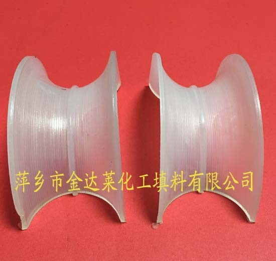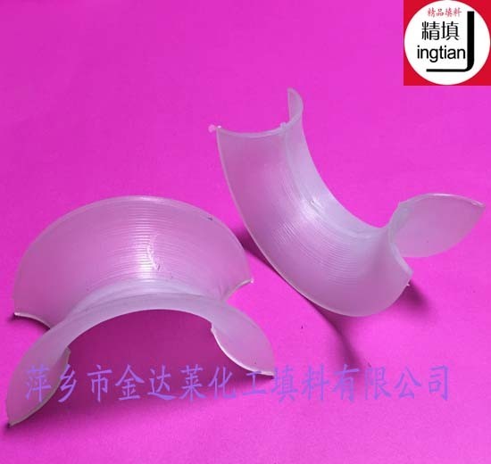聚丙烯矩鞍环是以贝尔弧环的改进,主要将一对弧形面改为矩形面,且内外曲率半径不同,从而避免了叠套的可能性;弧形侧面在填料床层内,增加了填料间接触的空隙,使之更有利于气体和液体在填料层中的流动和扩散其床层空隙率均匀,液体分布性能较好,具有压降低,传质效率高等特点。与贝尔弧鞍或拉西环相比,其通量大、压降低、效率高.